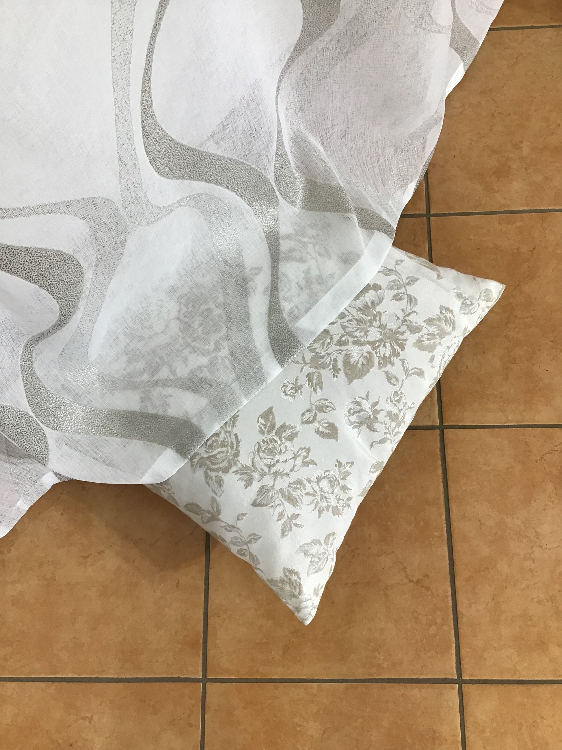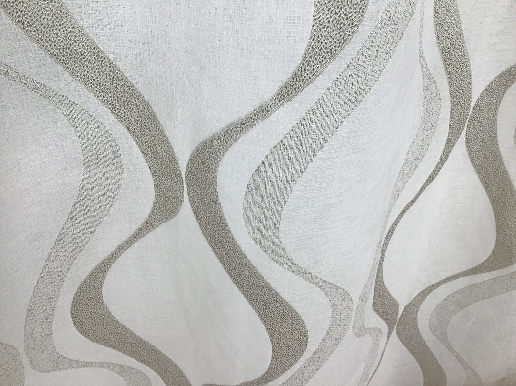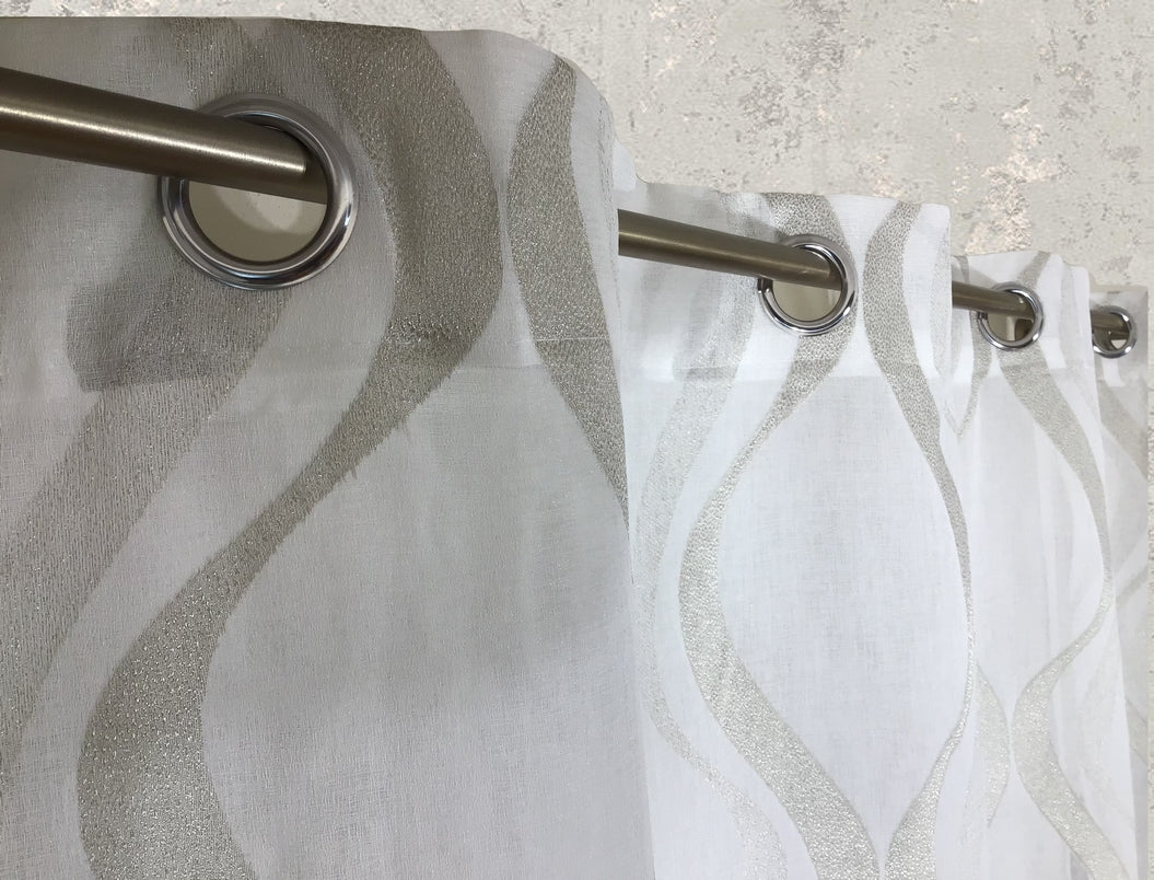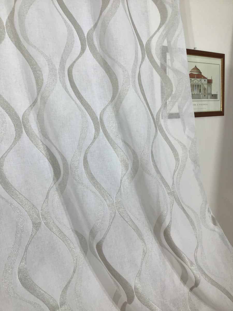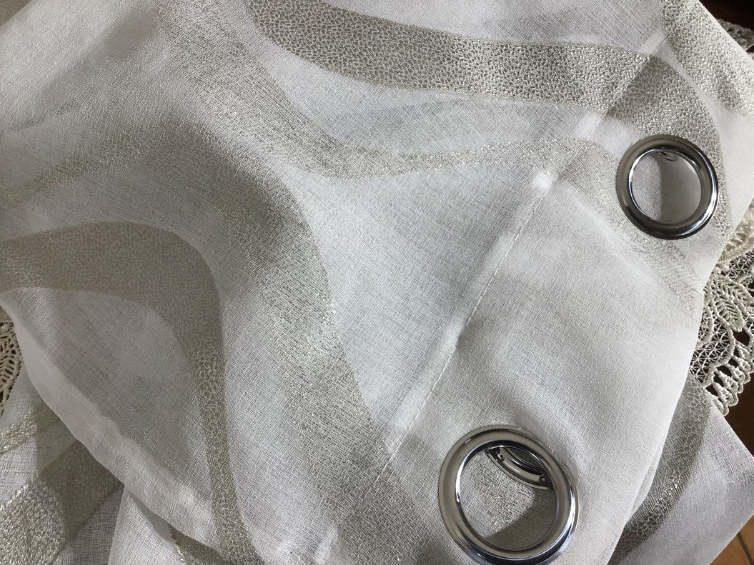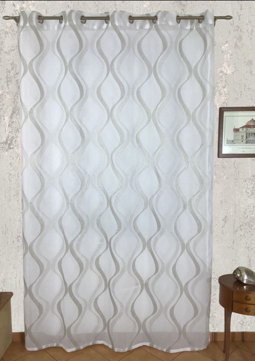 - Descrizione del prodotto: Si tratta di tende con 12 occhielli, composte da un singolo pannello di tessuto fil coupé, che offre un'elegante combinazione di colori bianco e tortora.